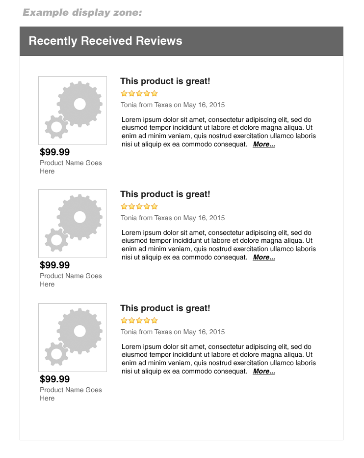 Product information is included with each review (image, text/link, pricing) to automatically merchandise pages with well regarded items.